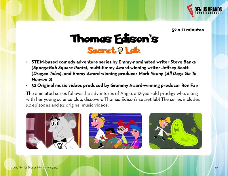 Thomas Edison’s secret lab - STEM-based comedy adventure series by Emmy-nominated writer Steve Banks (SpongeBob Square Pants), multi-Emmy Award-winning writer Jeffrey Scott (Dragon Tales), and Emmy Award-winning producer Mark Young (All Dogs Go To Heaven 2) • 52 Original music videos produced by Grammy Award-winning producer Ron Fair The animated series follows the adventures of Angie, a 12-year-old prodigy who, along with her young science club, discovers Thomas Edison’s secret lab! The series includes 52 episodes and 52 original music videos.