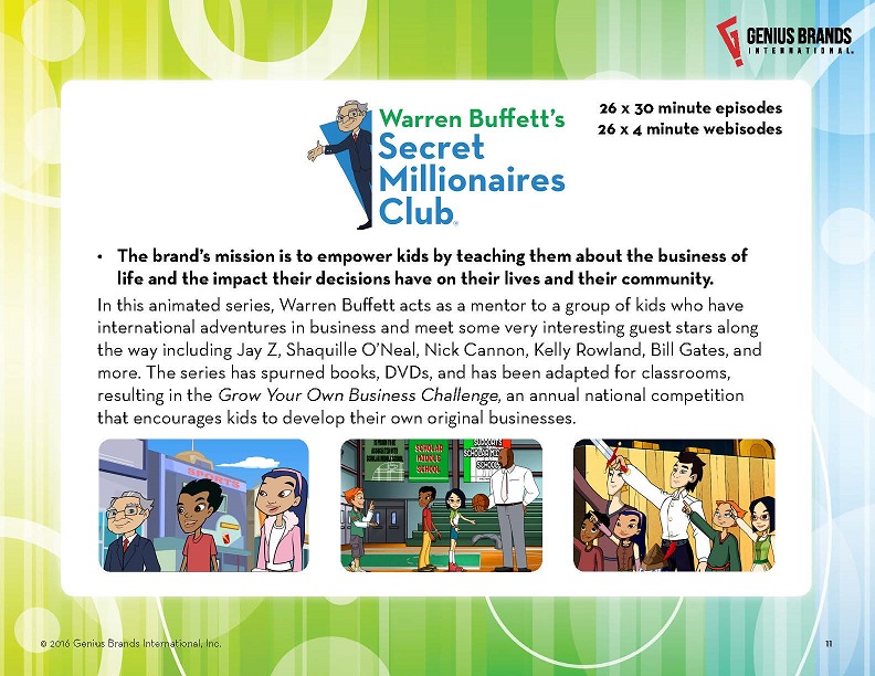 Warren Buffet’s millionare club The brand’s mission is to empower kids by teaching them about the business of life and the impact their decisions have on their lives and their community. In this animated series, Warren Buffett acts as a mentor to a group of kids who have international adventures in business and meet some very interesting guest stars along the way including Jay Z, Shaquille O’Neal, Nick Cannon, Kelly Rowland, Bill Gates, and more. The series has spurned books, DVDs, and has been adapted for classrooms, resulting in the Grow Your Own Business Challenge, an annual national competition that encourages kids to develop their own original businesses