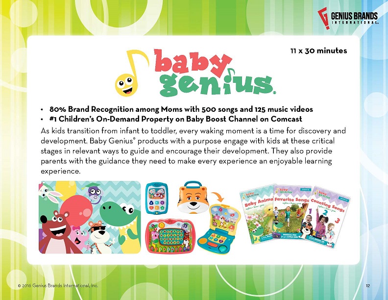 Baby Genius - 80% Brand Recognition among Moms with 500 songs and 125 music videos • #1 Children’s On-Demand Property on Baby Boost Channel on Comcast As kids transition from infant to toddler, every waking moment is a time for discovery and development. Baby Genius® products with a purpose engage with kids at these critical stages in relevant ways to guide and encourage their development. They also provide parents with the guidance they need to make every experience an enjoyable learning experience.