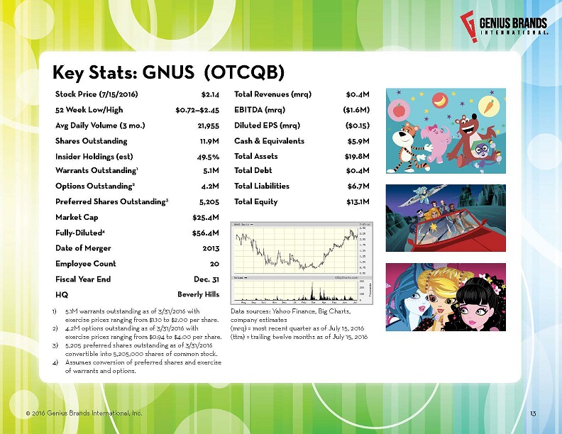Key stats - Stock Price (7/15/2016) $2.14 52 Week Low/High $0.72—$2.45 Avg Daily Volume (3 mo.) 21,955 Shares Outstanding 11.9M Insider Holdings (est) 49.5% Warrants Outstanding1 5.1M Options Outstanding2 4.2M Preferred Shares Outstanding3 5,205 Market Cap $25.4M Fully-Diluted4 $56.4M Date of Merger 2013 Employee Count 20 Fiscal Year End Dec. 31 HQ Beverly Hills Total Revenues (mrq) $0.4M EBITDA (mrq) ($1.6M) Diluted EPS (mrq) ($0.15) Cash & Equivalents $5.9M Total Assets $19.8M Total Debt $0.4M Total Liabilities $6.7M Total Equity $13.1M 1) 5.1M warrants outstanding as of 3/31/2016 with exercise prices ranging from $1.10 to $2.00 per share. 2) 4.2M options outstanding as of 3/31/2016 with exercise prices ranging from $0.94 to $4.00 per share. 3) 5,205 preferred shares outstanding as of 3/31/2016 convertible into 5,205,000 shares of common stock. 4) Assumes conversion of preferred shares and exercise of warrants and options. Key Data sources: Yahoo Finance, Big Charts, company estimates (mrq) = most recent quarter as of July 15, 2016 (ttm) = trailing twelve months as of July 15, 2016
