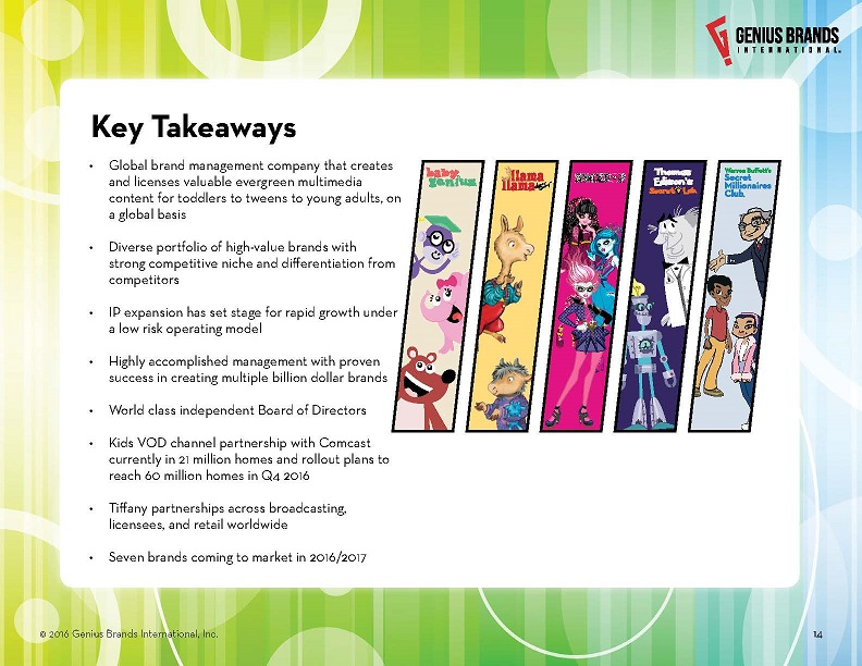 Key Takeaways Global brand management company that creates and licenses valuable evergreen multimedia content for toddlers to tweens to young adults, on a global basis • Diverse portfolio of high-value brands with strong competitive niche and differentiation from competitors • IP expansion has set stage for rapid growth under a low risk operating model • Highly accomplished management with proven success in creating multiple billion dollar brands • World class independent Board of Directors • Kids VOD channel partnership with Comcast currently in 21 million homes and rollout plans to reach 60 million homes in Q4 2016 • Tiffany partnerships across broadcasting, licensees, and retail worldwide • Seven brands coming to market in 2016/2017