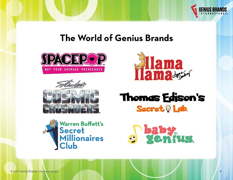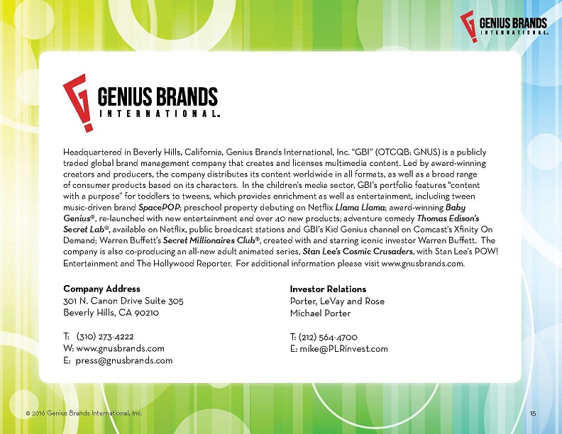 Headquartered in Beverly Hills, California, Genius Brands International, Inc. “GBI” (OTCQB: GNUS) is a publicly traded global brand management company that creates and licenses multimedia content. Led by award-winning creators and producers, the company distributes its content worldwide in all formats, as well as a broad range of consumer products based on its characters. In the children’s media sector, GBI’s portfolio features “content with a purpose” for toddlers to tweens, which provides enrichment as well as entertainment, including tween music-driven brand SpacePOP; preschool property debuting on Netflix Llama Llama; award-winning Baby Genius®, re-launched with new entertainment and over 40 new products; adventure comedy Thomas Edison’s Secret Lab®, available on Netflix, public broadcast stations and GBI’s Kid Genius channel on Comcast’s Xfinity On Demand; Warren Buffett’s Secret Millionaires Club®, created with and starring iconic investor Warren Buffett. The company is also co-producing an all-new adult animated series, Stan Lee’s Cosmic Crusaders, with Stan Lee’s POW! Entertainment and The Hollywood Reporter. For additional information please visit www.gnusbrands.com. Company Address 301 N. Canon Drive Suite 305 Beverly Hills, CA 90210 T: (310) 273-4222 W: www.gnusbrands.com E: press@gnusbrands.com Investor Relations Porter, LeVay and Rose Michael Porter T: (212) 564-4700 E: mike@PLRinvest.com