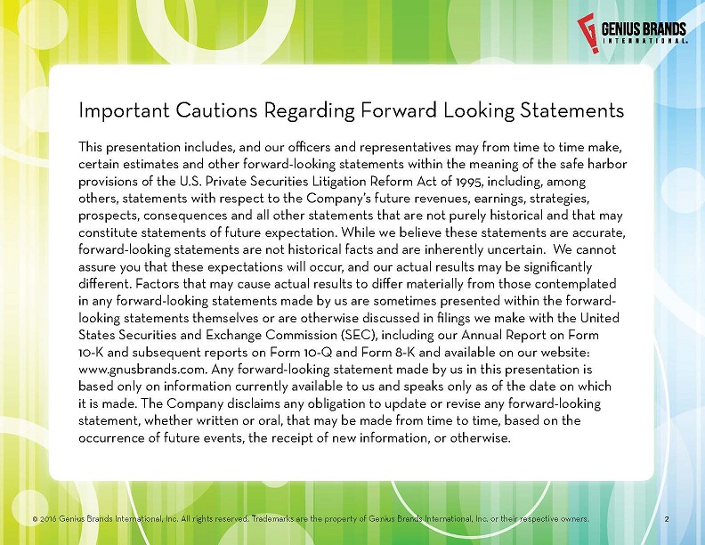 Important Cautions Regarding Forward Looking Statements This presentation includes, and our officers and representatives may from time to time make, certain estimates and other forward-looking statements within the meaning of the safe harbor provisions of the U.S. Private Securities Litigation Reform Act of 1995, including, among others, statements with respect to the Company’s future revenues, earnings, strategies, prospects, consequences and all other statements that are not purely historical and that may constitute statements of future expectation. While we believe these statements are accurate, forward-looking statements are not historical facts and are inherently uncertain. We cannot assure you that these expectations will occur, and our actual results may be significantly different. Factors that may cause actual results to differ materially from those contemplated in any forward-looking statements made by us are sometimes presented within the forwardlooking statements themselves or are otherwise discussed in filings we make with the United States Securities and Exchange Commission (SEC), including our Annual Report on Form 10-K and subsequent reports on Form 10-Q and Form 8-K and available on our website: www.gnusbrands.com. Any forward-looking statement made by us in this presentation is based only on information currently available to us and speaks only as of the date on which it is made. The Company disclaims any obligation to update or revise any forward-looking statement, whether written or oral, that may be made from time to time, based on the occurrence of future events, the receipt of new information, or otherwise.