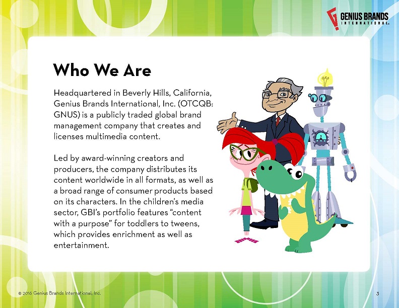 who we are Headquartered in Beverly Hills, California, Genius Brands International, Inc. (OTCQB: GNUS) is a publicly traded global brand management company that creates and licenses multimedia content. Led by award-winning creators and producers, the company distributes its content worldwide in all formats, as well as a broad range of consumer products based on its characters. In the children’s media sector, GBI’s portfolio features “content with a purpose” for toddlers to tweens, which provides enrichment as well as entertainment.