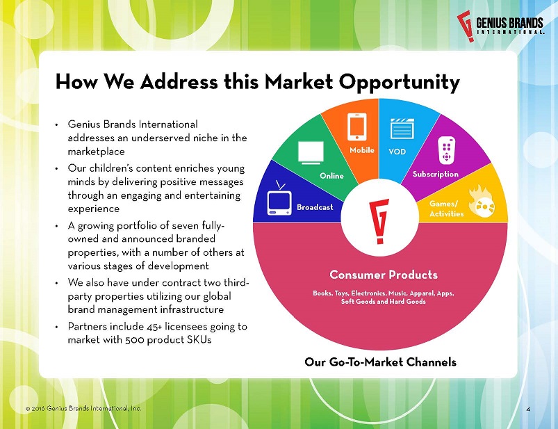 How We Address this Market OpportunityGenius Brands International addresses an underserved niche in the marketplace • Our children’s content enriches young minds by delivering positive messages through an engaging and entertaining experience • A growing portfolio of seven fullyowned and announced branded properties, with a number of others at various stages of development • We also have under contract two thirdparty properties utilizing our global brand management infrastructure • Partners include 45+ licensees going to market with 500 product SKUs Our Go-To-Market Channels