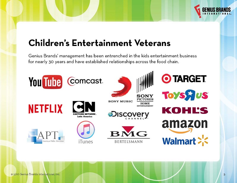 Children’s Entertainment Veterans Genius Brands’ management has been entrenched in the kids entertainment business for nearly 30 years and have established relationships across the food chain.
