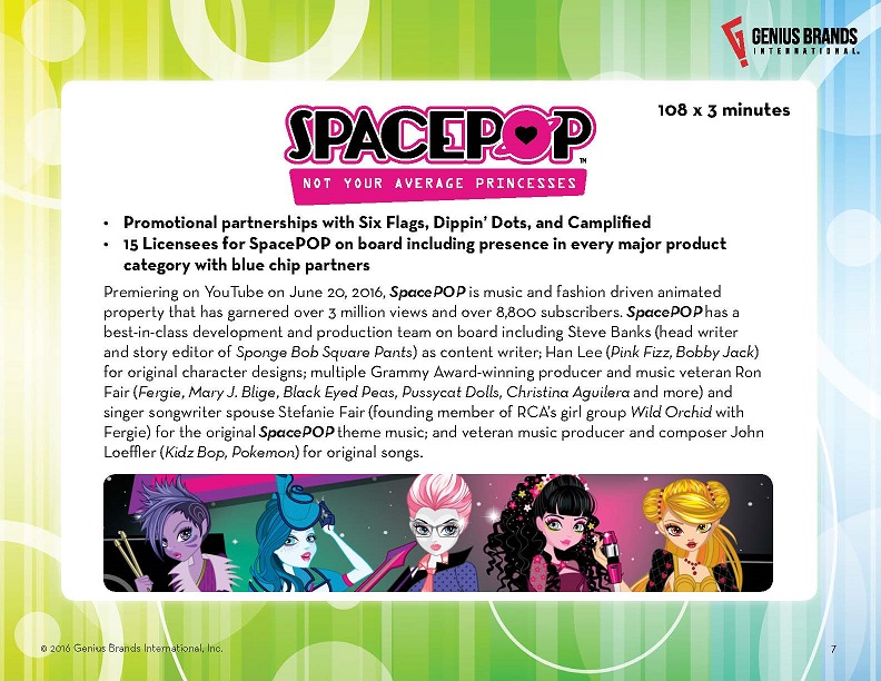 Spacepop Promotional partnerships with Six Flags, Dippin’ Dots, and Camplified • 15 Licensees for SpacePOP on board including presence in every major product category with blue chip partners Premiering on YouTube on June 20, 2016, SpacePOP is music and fashion driven animated property that has garnered over 3 million views and over 8,800 subscribers. SpacePOP has a best-in-class development and production team on board including Steve Banks (head writer and story editor of Sponge Bob Square Pants) as content writer; Han Lee (Pink Fizz, Bobby Jack) for original character designs; multiple Grammy Award-winning producer and music veteran Ron Fair (Fergie, Mary J. Blige, Black Eyed Peas, Pussycat Dolls, Christina Aguilera and more) and singer songwriter spouse Stefanie Fair (founding member of RCA’s girl group Wild Orchid with Fergie) for the original SpacePOP theme music; and veteran music producer and composer John Loeffler (Kidz Bop, Pokemon) for original songs.