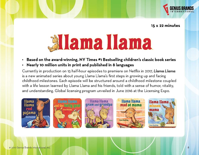 llama llama Based on the award-winning, NY Times #1 Bestselling children’s classic book series • Nearly 10 million units in print and published in 8 languages Currently in production on 15 half-hour episodes to premiere on Netflix in 2017, Llama Llama is a new animated series about young Llama Llama’s first steps in growing up and facing childhood milestones. Each episode will be structured around a childhood milestone coupled with a life lesson learned by Llama Llama and his friends, told with a sense of humor, vitality, and understanding. Global licensing program unveiled in June 2016 at the Licensing Expo.