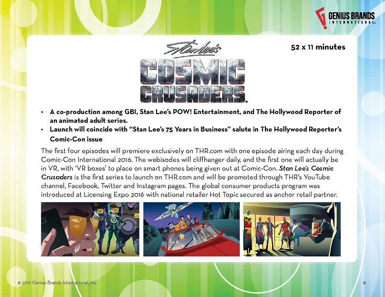 Cosmic Crusaders A co-production among GBI, Stan Lee’s POW! Entertainment, and The Hollywood Reporter of an animated adult series. • Launch will coincide with “Stan Lee’s 75 Years in Business” salute in The Hollywood Reporter’s Comic-Con issue The first four episodes will premiere exclusively on THR.com with one episode airing each day during Comic-Con International 2016. The webisodes will cliffhanger daily, and the first one will actually be in VR, with ‘VR boxes’ to place on smart phones being given out at Comic-Con. Stan Lee’s Cosmic Crusaders is the first series to launch on THR.com and will be promoted through THR’s YouTube channel, Facebook, Twitter and Instagram pages. The global consumer products program was introduced at Licensing Expo 2016 with national retailer Hot Topic secured as anchor retail partner.