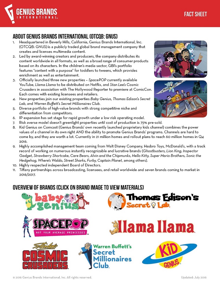 ABOUT GENIUS BRANDS INTERNATIONAL (OTCQB: GNUS) 1. Headquartered in Beverly Hills, California, Genius Brands International, Inc. (OTCQB: GNUS) is a publicly traded global brand management company that creates and licenses multimedia content. 2. Led by award-winning creators and producers, the company distributes its content worldwide in all formats, as well as a broad range of consumer products based on its characters. In the children’s media sector, GBI’s portfolio features “content with a purpose” for toddlers to tweens, which provides enrichment as well as entertainment. 3. Officially launched three new properties – SpacePOP currently available YouTube, Llama Llama to be distributed on Netflix, and Stan Lee’s Cosmic Crusaders in association with The Hollywood Reporter to premiere at ComicCon. Each comes with existing licensees and retailers. 4. New properties join our existing properties Baby Genius, Thomas Edison’s Secret Lab, and Warren Buffett’s Secret Millionaires Club. 5. Diverse portfolio of high-value brands with strong competitive niche and differentiation from competitors. 6. IP expansion has set stage for rapid growth under a low risk operating model. 7. Risk averse model doesn’t greenlight properties until cost of production is 75% pre-sold. 8. Kid Genius on Comcast (Genius Brands’ own recently launched proprietary kids channel) combines the power values of a channel in its own right AND the ability to promote Genius Brands’ programs. Channels are hard to come by, and they are worth a lot. Currently in 21 million homes and rollout plans to reach 60 million homes in Q4 2016. 9. Highly accomplished management team coming from Walt Disney Company, Hasbro Toys, McDonald’s, with a track record of working on numerous instantly recognizable and lucrative brands (Ghostbusters, Lion King, Inspector Gadget, Strawberry Shortcake, Care Bears, Alvin and the Chipmunks, Hello Kitty, Super Mario Brothers, Sonic the Hedgehog, Where’s Waldo, Street Sharks, Furby, Captain Planet, among others). 10. Highly respected independent Board of Directors. 11. Tiffany partnerships across broadcasting, licensees, and retail worldwide and seven brands coming to market in 2016/2017. OVERVIEW OF BRANDS (Click on BRAND IMAGE TO VIEW MATERIALS)