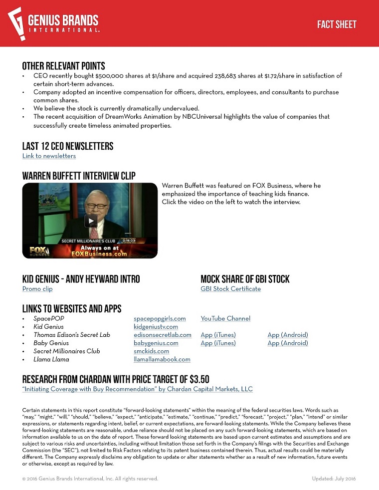 © 2016 Genius Brands International, Inc. All rights reserved. Updated: July 2016 FACT SHEET ABOUT GENIUS BRANDS INTERNATIONAL (OTCQB: GNUS) 1. Headquartered in Beverly Hills, California, Genius Brands International, Inc. (OTCQB: GNUS) is a publicly traded global brand management company that creates and licenses multimedia content. 2. Led by award-winning creators and producers, the company distributes its content worldwide in all formats, as well as a broad range of consumer products based on its characters. In the children’s media sector, GBI’s portfolio features “content with a purpose” for toddlers to tweens, which provides enrichment as well as entertainment. 3. Officially launched three new properties – SpacePOP currently available YouTube, Llama Llama to be distributed on Netflix, and Stan Lee’s Cosmic Crusaders in association with The Hollywood Reporter to premiere at ComicCon. Each comes with existing licensees and retailers. 4. New properties join our existing properties Baby Genius, Thomas Edison’s Secret Lab, and Warren Buffett’s Secret Millionaires Club. 5. Diverse portfolio of high-value brands with strong competitive niche and differentiation from competitors. 6. IP expansion has set stage for rapid growth under a low risk operating model. 7. Risk averse model doesn’t greenlight properties until cost of production is 75% pre-sold. 8. Kid Genius on Comcast (Genius Brands’ own recently launched proprietary kids channel) combines the power values of a channel in its own right AND the ability to promote Genius Brands’ programs. Channels are hard to come by, and they are worth a lot. Currently in 21 million homes and rollout plans to reach 60 million homes in Q4 2016. 9. Highly accomplished management team coming from Walt Disney Company, Hasbro Toys, McDonald’s, with a track record of working on numerous instantly recognizable and lucrative brands (Ghostbusters, Lion King, Inspector Gadget, Strawberry Shortcake, Care Bears, Alvin and the Chipmunks, Hello Kitty, Super Mario Brothers, Sonic the Hedgehog, Where’s Waldo, Street Sharks, Furby, Captain Planet, among others). 10. Highly respected independent Board of Directors. 11. Tiffany partnerships across broadcasting, licensees, and retail worldwide and seven brands coming to market in 2016/2017. OVERVIEW OF BRANDS (Click on BRAND IMAGE TO VIEW MATERIALS) © 2016 Genius Brands International, Inc. All rights reserved. Updated: July 2016 FACT SHEET OTHER RELEVANT POINTS • CEO recently bought $500,000 shares at $1/share and acquired 238,683 shares at $1.72/share in satisfaction of certain short-term advances. • Company adopted an incentive compensation for officers, directors, employees, and consultants to purchase common shares. • We believe the stock is currently dramatically undervalued. • The recent acquisition of DreamWorks Animation by NBCUniversal highlights the value of companies that successfully create timeless animated properties. LAST 12 CEO NEWSLETTERS Link to newsletters WARREN BUFFETT INTERVIEW CLIP Warren Buffett was featured on FOX Business, where he emphasized the importance of teaching kids finance. Click the video on the left to watch the interview. KID GENIUS - ANDY HEYWARD INTRO MOCK SHARE OF GBI STOCK Promo clip GBI Stock Certificate LINKS TO WEBSITES AND APPS • SpacePOP spacepopgirls.com YouTube Channel • Kid Genius kidgeniustv.com • Thomas Edison’s Secret Lab edisonsecretlab.com App (iTunes) App (Android) • Baby Genius babygenius.com App (iTunes) App (Android) • Secret Millionaires Club smckids.com • Llama Llama llamallamabook.com RESEARCH FROM CHARDAN WITH PRICE TARGET OF $3.50 “Initiating Coverage with Buy Recommendation” by Chardan Capital Markets, LLC Certain statements in this report constitute “forward-looking statements” within the meaning of the federal securities laws. Words such as “may,” “might,” “will,” “should,” “believe,” “expect,” “anticipate,” “estimate,” “continue,” “predict,” “forecast,” “project,” “plan,” “intend” or similar expressions, or statements regarding intent, belief, or current expectations, are forward-looking statements. While the Company believes these forward-looking statements are reasonable, undue reliance should not be placed on any such forward-looking statements, which are based on information available to us on the date of report. These forward looking statements are based upon current estimates and assumptions and are subject to various risks and uncertainties, including without limitation those set forth in the Company’s filings with the Securities and Exchange Commission (the “SEC”), not limited to Risk Factors relating to its patent business contained therein. Thus, actual results could be materially different. The Company expressly disclaims any obligation to update or alter statements whether as a result of new information, future events or otherwise, except as required by law.