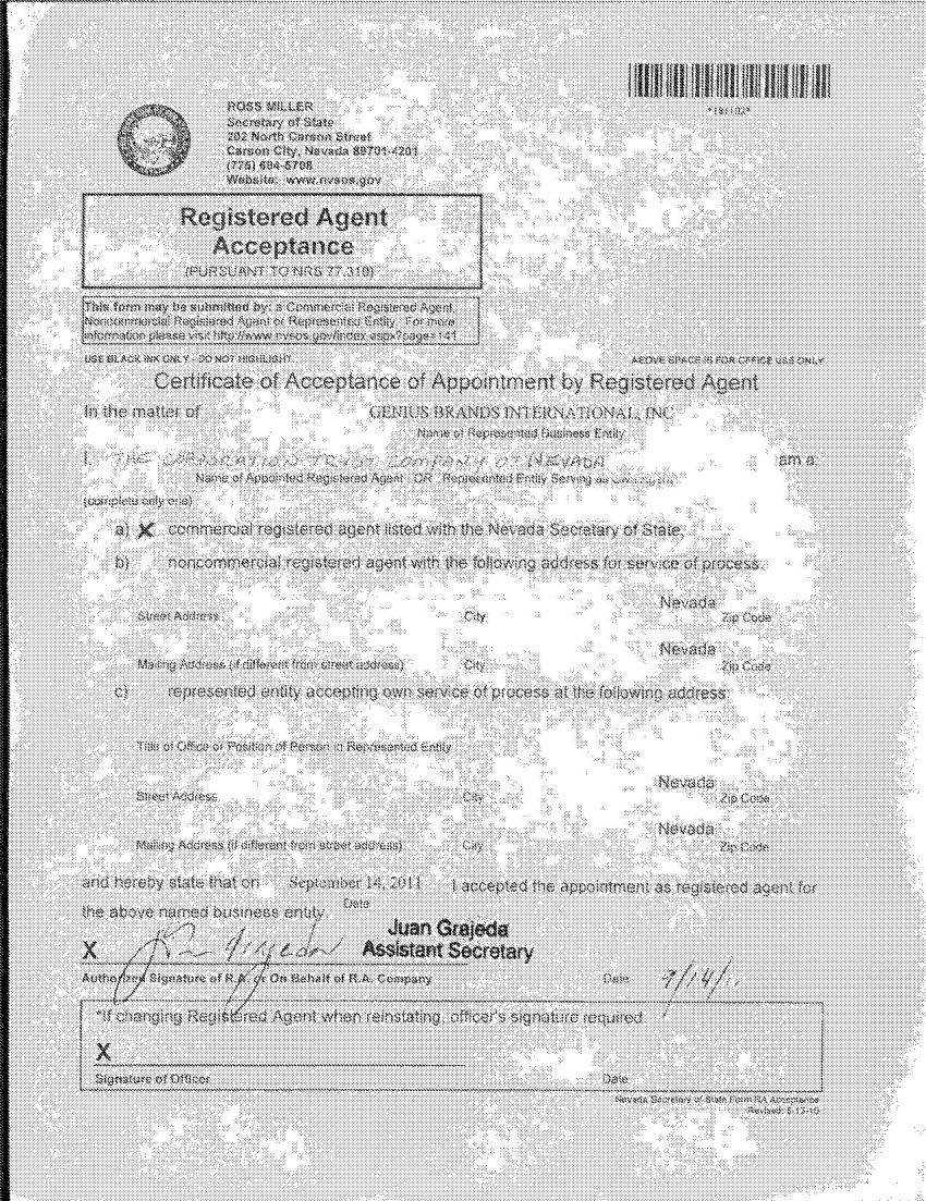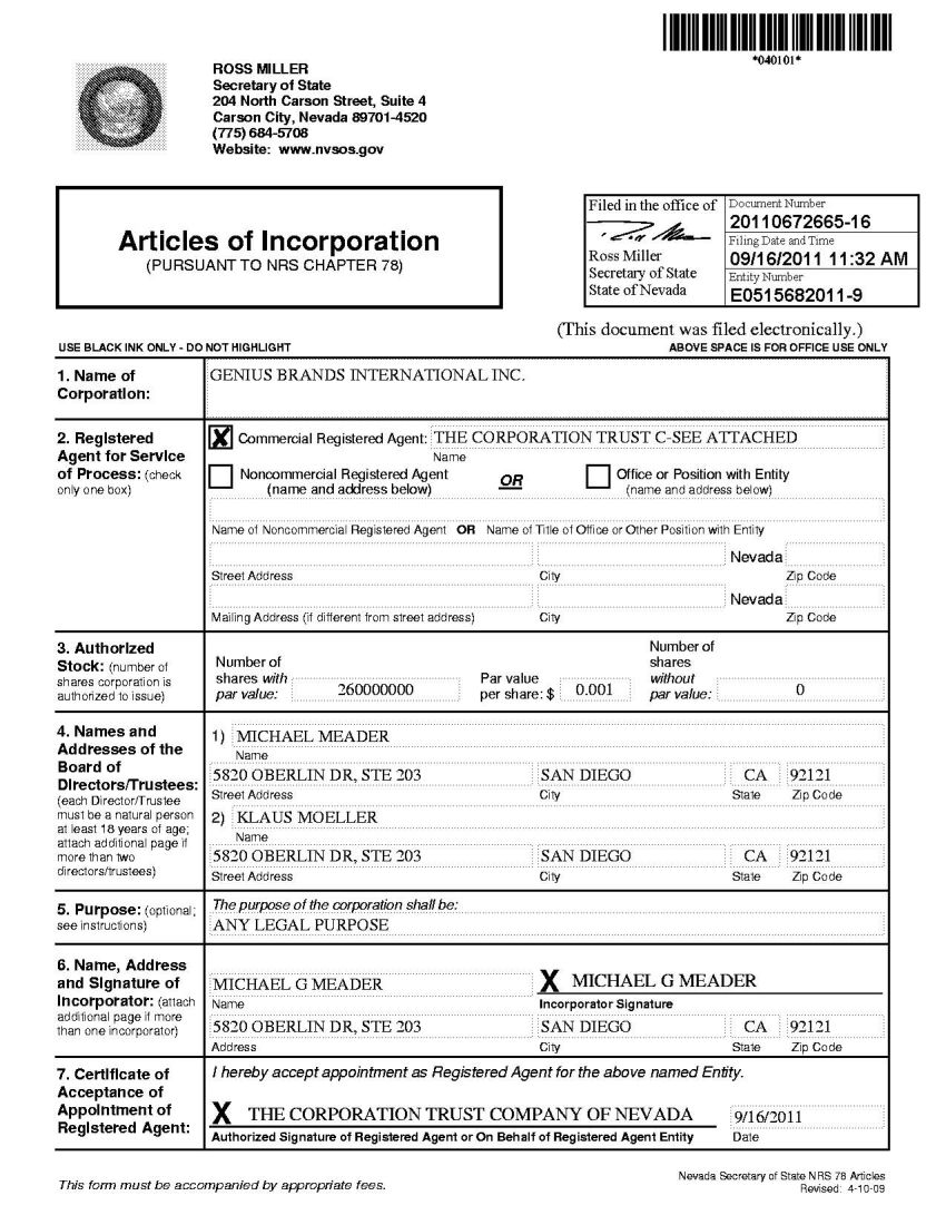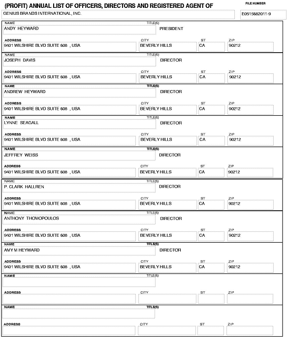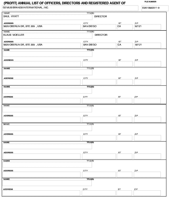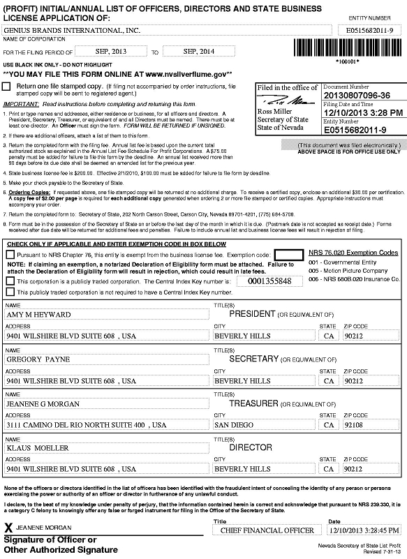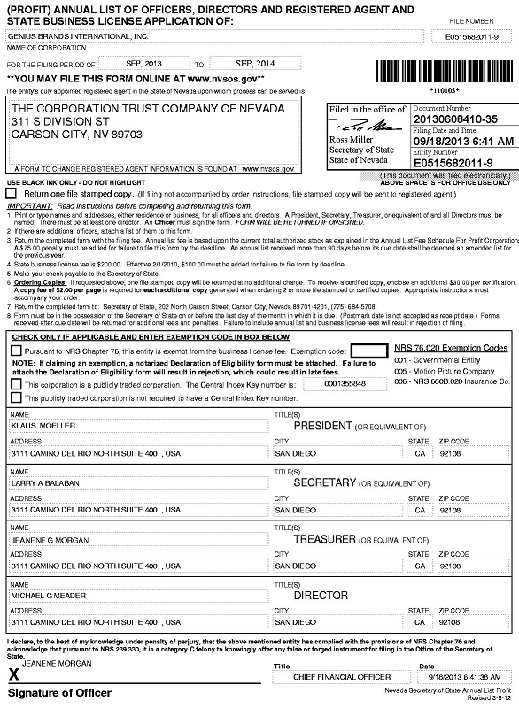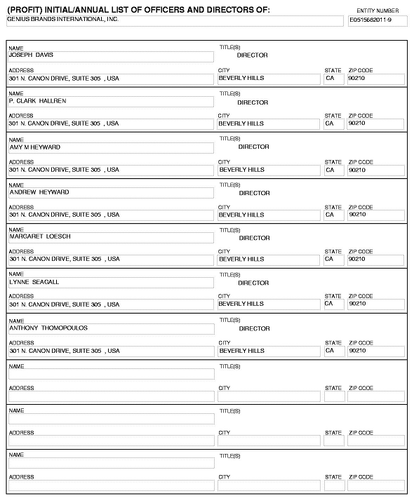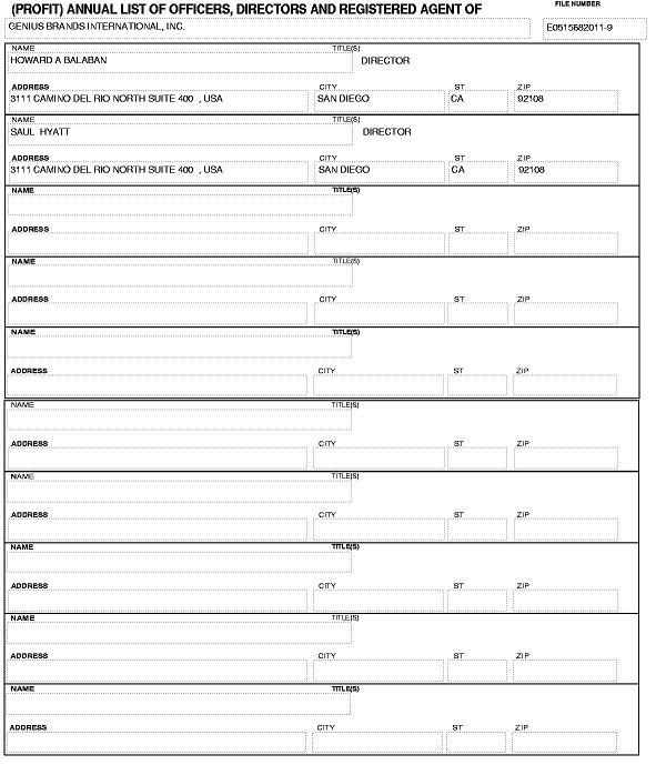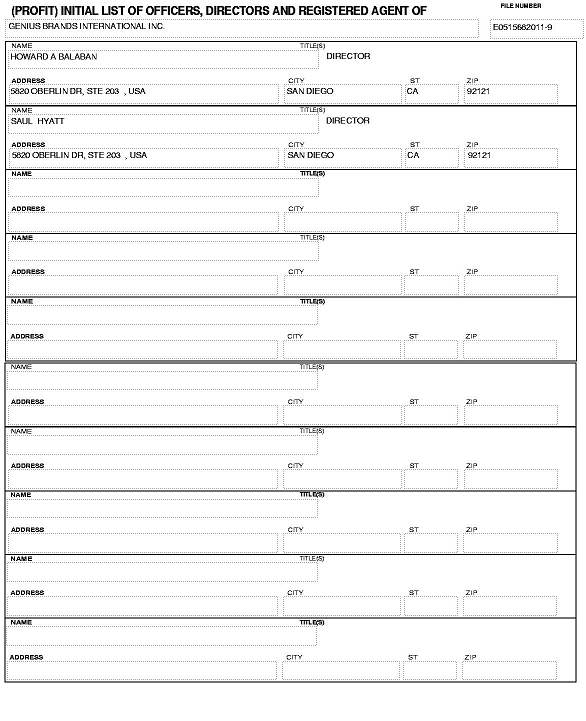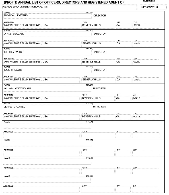 (Profit) Initial List of Officers, Directors and Registered Agent and State Business License Application of Genius Brands International, Inc. 9/16/2011