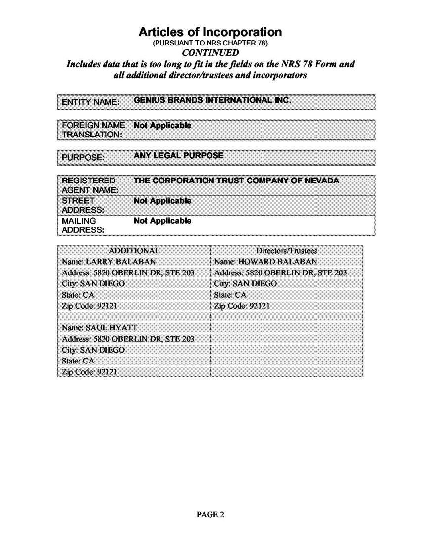 The name of the corporation is Genius Brands International, Inc. (the "Corporation").