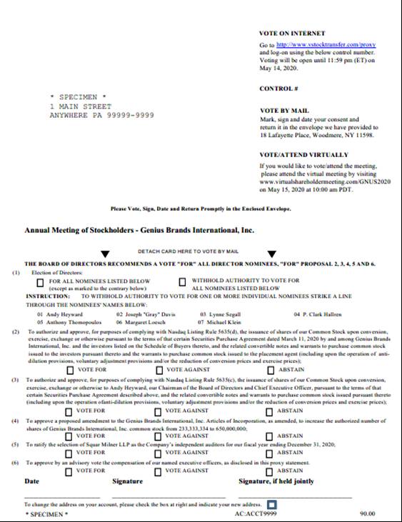 The undersigned stockholder of Genius Brands International, Inc., a Nevada corporation (the “Company”), revoking all prior proxies, hereby appoints Andy Heyward, Robert L. Denton and Michael Jaffa, and each of them, with full power to act without the other and with power of substitution, as proxies and attorneys-in-fact and hereby authorizes them to represent and vote all shares of Common Stock, par value $0.001 per share (the “Common Stock”) of the Company, which the undersigned will be entitled to vote if personally present at the Annual Meeting of Stockholders of the Company to be held on May 15, 2020, at 10:00 a.m. PDT at 190 N. Canon Drive, 4th Floor, Beverly Hills, California 90210, and at any adjournment or postponement thereof. Each share of Common Stock is entitled to one vote. The proxies are further authorized to vote, in their discretion, upon such other business as may properly come before the meeting.