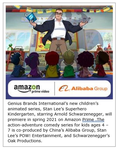 BEVERLY HILLS, Calif., April 20, 2020 (GLOBE NEWSWIRE) -- Genius Brands International “Genius Brands” (NASDAQ: GNUS) announced today the spring 2021 premiere of its new children’s animated series, Stan Lee’s Superhero Kindergarten, starring Arnold Schwarzenegger, on Amazon Prime (NASDAQ:AMZN). Amazon Prime joins Alibaba Group’s (NYSE:BABA) which will launch the series in China on its video streaming platform for kids, Youku.
