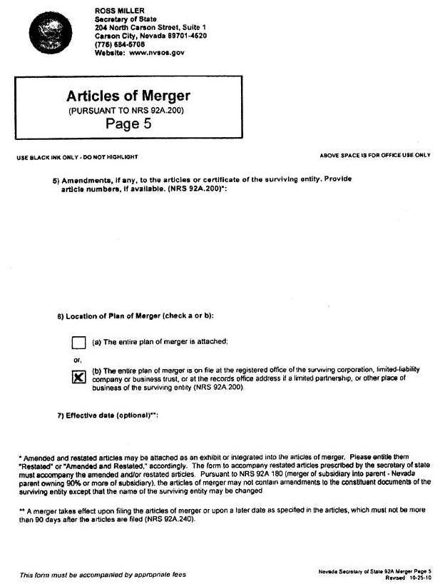 | THIRD: | That the stockholders of the Corporation have approved the following amendment to the Articles pursuant to NRS 78.385 and NRS 78.390, such amendment to become effective immediately upon filing with the Nevada Secretary of State: |