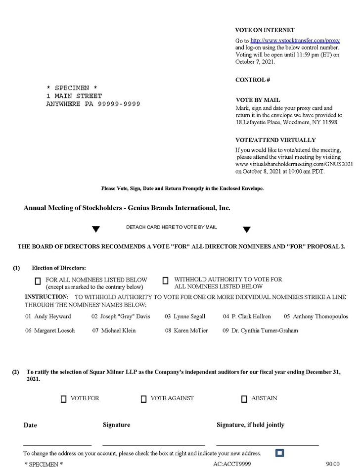 The undersigned stockholder of Genius Brands International, Inc., a Nevada corporation (the “Company”), revoking all prior proxies, hereby appoints Andy Heyward, Robert L. Denton and Michael Jaffa, and each of them, with full power to act without the other and with power of substitution, as proxies and attorneys-in-fact and hereby authorizes them to represent and vote all shares of Common Stock, par value $0.001 per share (the “Common Stock”) of the Company, which the undersigned will be entitled to vote if personally present at the Annual Meeting of Stockholders of the Company to be held via live webcast on the Internet on October 8, 2021, at 10:00 a.m. PDT, and at any adjournment or postponement thereof. Each share of Common Stock is entitled to one vote. The proxies are further authorized to vote, in their discretion, upon such other business as may properly come before the meeting.