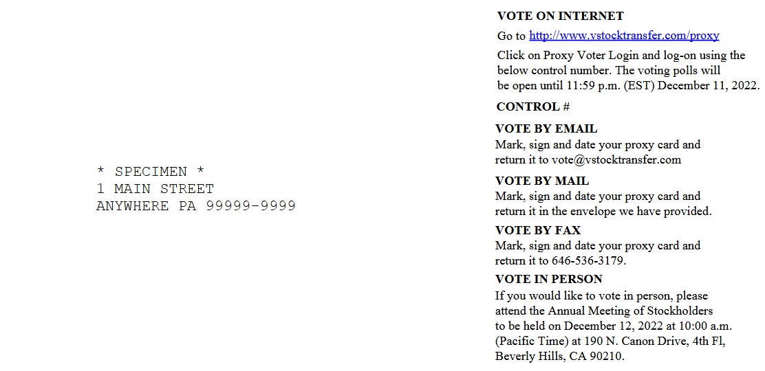 Our board of directors is soliciting your proxy to vote at the 2022 annual meeting of stockholders to be held at 190 N. Canon Drive, 4th Fl., Beverly Hills, CA 90210 on December 12, 2022, at 10:00 a.m. Pacific Standard Time and any adjournments or postponements of the meeting, which we refer to as the annual meeting. This proxy statement, along with the accompanying Notice of 2021 annual meeting of stockholders, summarizes the purposes of the meeting and the information you need to know to vote at the annual meeting.