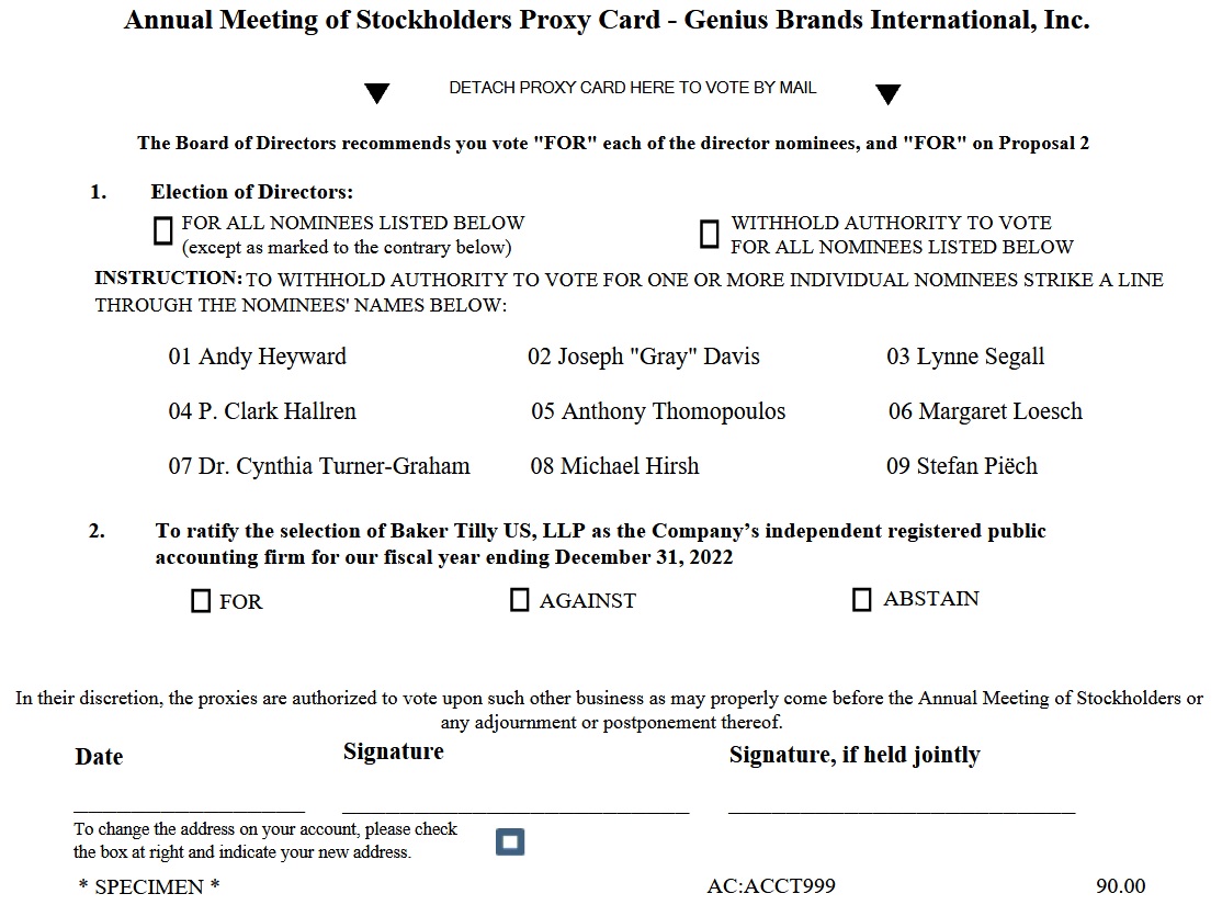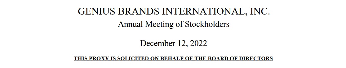 You are cordially invited to attend the 2022 annual meeting of stockholders (the “Annual Meeting of Stockholders”), of Genius Brands International, Inc., a Nevada corporation (the “Company”), to be held at 10:00 a.m., Pacific Standard Time, on December 12, 2022 at 190 N. Canon Drive, 4th Fl., Beverly Hills, CA 90210.
