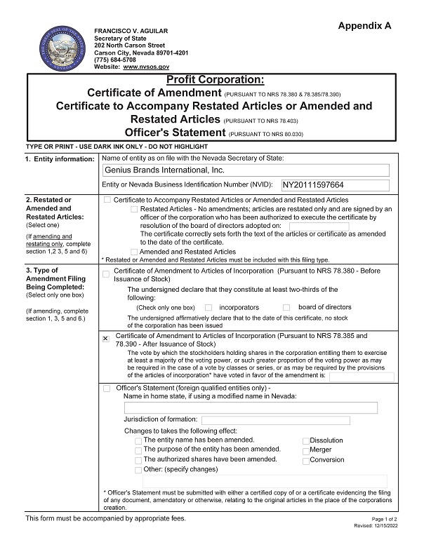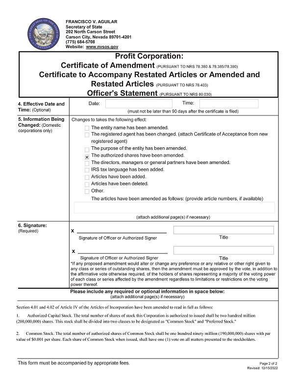 At the Annual Meeting, we will ask stockholders to (i) elect nine (9) persons to our board of directors (Proposal 1), (ii) ratify the appointment of Baker Tilly US, LLP as the Company’s independent auditors for our fiscal year ending December 31, 2023 (Proposal 2), (iii) approve a proposed amendment to the Company’s Articles of Incorporation, as amended (the “Articles of Incorporation”) to increase our authorized shares of common stock, par value $0.001 per share (the “Common Stock”), from 40,000,000 shares to 190,000,000 shares with a corresponding increase in the total number of authorized shares of capital stock of the Company from 50,000,000 shares to 200,000,000 shares (Proposal 3), (iv) approve a proposal to change the Company’s state of incorporation from Nevada to Delaware (Proposal 4), (v) approve, in accordance with Section 713(A) of the NYSE American Company Guide, the issuance of more than 19.99% of our outstanding Common Stock upon the exercise of certain common stock purchase warrants (Proposal 5), (vi) approve, by an advisory vote, the compensation of our named executive officers, as disclosed in this proxy statement (Proposal 6), (vii) approve, by an advisory vote, the frequency of holding future advisory votes on the compensation of our named executive officers (Proposal 7), and (viii) approve a proposal to adjourn the Annual Meeting to solicit additional proxies if there are insufficient votes at the time of the meeting to approve Proposals 3 and/or 4 (Proposal 8).
