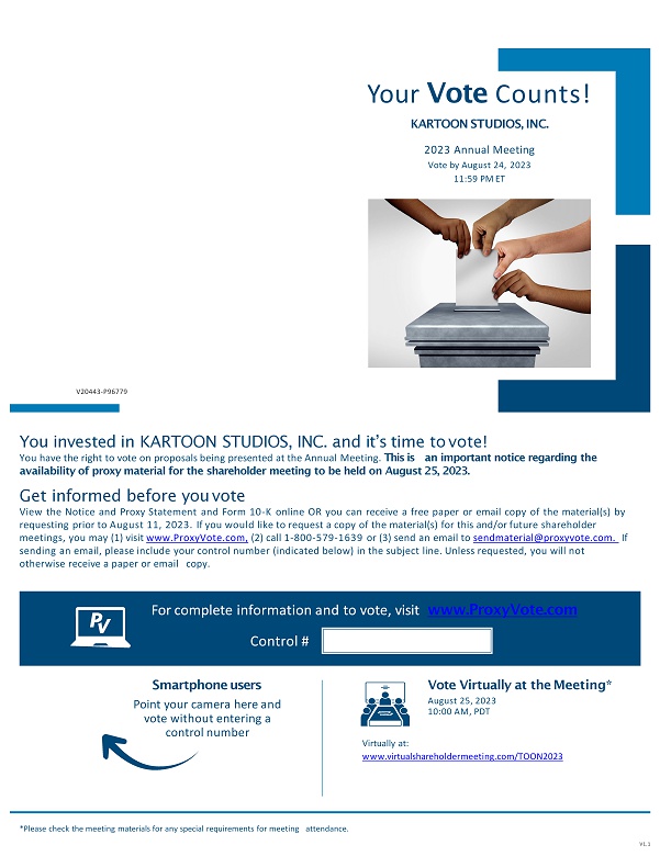 Smartphone users Point your camera here and vote without entering a control number V1.1 Your Vote Counts! KARTOON STUDIOS, INC. 2023 Annual Meeting Vote by August 24, 2023 11:59 PM ET For complete information and to vote, visit www.ProxyVote.com Control # V20443 - P96779 You invested in KARTOON STUDIOS, INC. and it’s time to vote! You have the right to vote on proposals being presented at the Annual Meeting. This is an important notice regarding the availability of proxy material for the shareholder meeting to be held on August 25, 2023. Get informed before you vote View the Notice and Proxy Statement and Form 10 - K online OR you can receive a free paper or email copy of the material(s) by requesting prior to August 11, 2023. If you would like to request a copy of the material(s) for this and/or future shareholder meetings, you may (1) visit www.ProxyVote.com, (2) call 1 - 800 - 579 - 1639 or (3) send an email to sendmaterial@proxyvote.com. If sending an email, please include your control number (indicated below) in the subject line. Unless requested, you will not otherwise receive a paper or email copy. Vote Virtually at the Meeting* August 25, 2023 10:00 AM, PDT Virtually at: ww w.virtualsha r eholdermeeting.com/TOON2023 *Please check the meeting materials for any special requirements for meeting attendance.