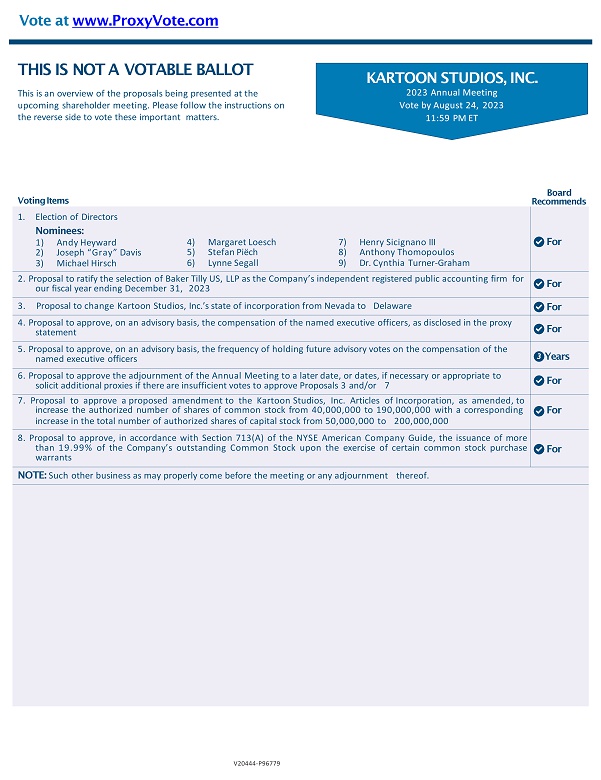 KARTOON STUDIOS, INC. 2023 Annual Meeting Vote by August 24, 2023 11:59 PM ET Voting Items Board Recommends THIS IS NOT A VOTABLE BALLOT This is an overview of the proposals being presented at the upcoming shareholder meeting. Please follow the instructions on the reverse side to vote these important matters. Vote at www.ProxyVote.com V20444 - P96779 NOTE: Such other business as may properly come before the meeting or any adjournment thereof. 4) Margaret Loesch 5) Stefan Piëch 6) Lynne Segall 7) Henry Sicignano III 8) Anthony Thomopoulos 9) Dr. Cynthia Turner - Graham 1. Election of Directors Nominees: 1) Andy Heyward 2) Joseph “Gray” Davis 3) Michael Hirsch 2. Proposal to ratify the selection of Baker Tilly US, LLP as the Company’s independent registered public accounting firm for our fiscal year ending December 31, 2023 8 . Proposal to approve, in accordance with Section 713 (A) of the NYSE American Company Guide, the issuance of more than 19 . 99 % of the Company’s outstanding Common Stock upon the exercise of certain common stock purchase warrants 4. Proposal to approve, on an advisory basis, the compensation of the named executive officers, as disclosed in the proxy statement 6. Proposal to approve the adjournment of the Annual Meeting to a later date, or dates, if necessary or appropriate to solicit additional proxies if there are insufficient votes to approve Proposals 3 and/or 7 For 7. Proposal to approve a proposed amendment to the Kartoon Studios, Inc. Articles of Incorporation, as amended, to inc r ease the authorized number of sha r es of common stock f r om 40,000,000 to 190,000,000 with a cor r esponding For increase in the total number of authorized shares of capital stock from 50,000,000 to 200,000,000 For For For For For 5. Proposal to approve, on an advisory basis, the frequency of holding future advisory votes on the compensation of the named executive officers 3 Years 3. Proposal to change Kartoon Studios, Inc.’s state of incorporation from Nevada to Delaware