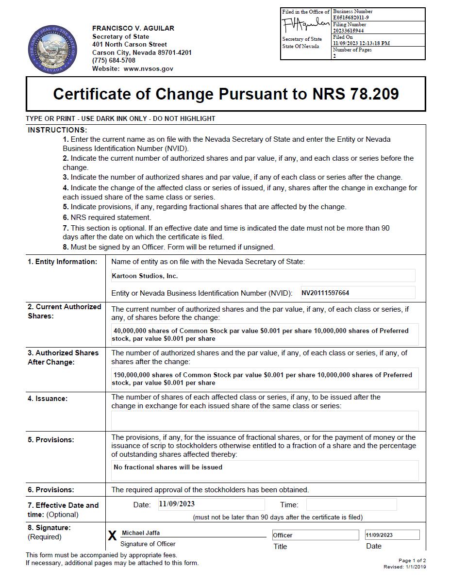 Certificate of Change Pursuant to NRS 78.209 TYPE OR PRINT - USE DARK INK ONLY - DO NOT HIGHLIGHT INSTRUCTIONS: 1. Enter the current name as on file with the Nevada Secretary of State and enter the Entity or Nevada Business Identification Number (NVID). 2. Indicate the current number of authorized shares and par value, if any, and each class or series before the change. 3. Indicate the number of authorized shares and par value, if any of each class or series after the change. 4. Indicate the change of the affected class or series of issued, if any, shares after the change in exchange for each issued share of the same class or series. 5. Indicate provisions, if any, regarding fractional shares that are affected by the change. 6. NRS required statement. 7. This section is optional. If an effective date and time is indicated the date must not be more than 90 days after the date on which the certificate is filed. 8. Must be signed by an Officer. Form will be returned if unsigned. Name of entity as on file with the Nevada Secretary of State: Kartoon Studios, Inc. Entity or Nevada Business Identification Number (NVID): NV20111597664 1. Entity Information: The current number of authorized shares and the par value, if any, of each class or series, if any, of shares before the change: 40,000,000 shares of Common Stock par value $0.001 per share 10,000,000 shares of Preferred stock, par value $0.001 per share 2. Current Authorized Shares: The number of authorized shares and the par value, if any, of each class or series, if any, of shares after the change: 190,000,000 shares of Common Stock par value $0.001 per share 10,000,000 shares of Preferred stock, par value $0.001 per share 3. Authorized Shares After Change: The number of shares of each affected class or series, if any, to be issued after the change in exchange for each issued share of the same class or series: 4. Issuance: The provisions, if any, for the issuance of fractional shares, or for the payment of money or the issuance of scrip to stockholders otherwise entitled to a fraction of a share and the percentage of outstanding shares affected thereby : No fractional shares will be issued 5. Provisions: The required approval of the stockholders has been obtained. 6. Provisions: Date: 11/09/2023 Time: (must not be later than 90 days after the certificate is filed) 7. Effective Date and time: (Optional) X Michael Jaffa Officer 11/09/2023 Signature of Officer Title Date 8. Signature: (Required) FRANCISCO V. AGUILAR Secretary of State 401 North Carson Street Carson City, Nevada 89701 - 4201 (775) 684 - 5708 Website: www.nvsos.gov Business Number E0515682011 - 9 Filed in the Office of Secretary of State State Of Nevada Filing Number 20233615944 Filed On 11/09/2023 12:13:18 PM Number of Pages 2 This form must be accompanied by appropriate fees. If necessary, additional pages may be attached to this form. Page 1 of 2 Revised: 1/1/2019