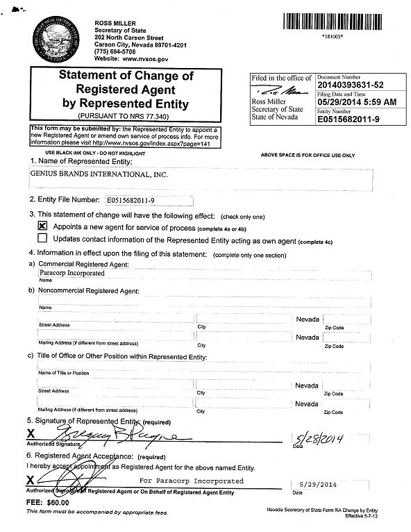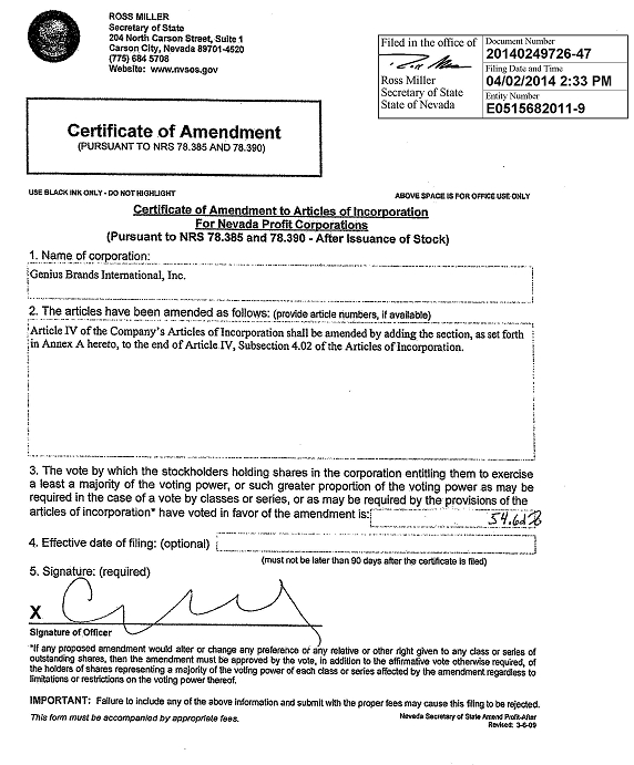 IN WITNESS WHEREOF, the Corporation has caused this Certificate of Designations of Series A Convertible Preferred Stock of Genius Brands International, Inc. to be signed by its Chief Executive Officer on this 14th day of May, 2014.