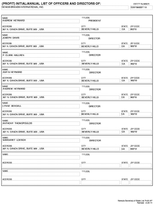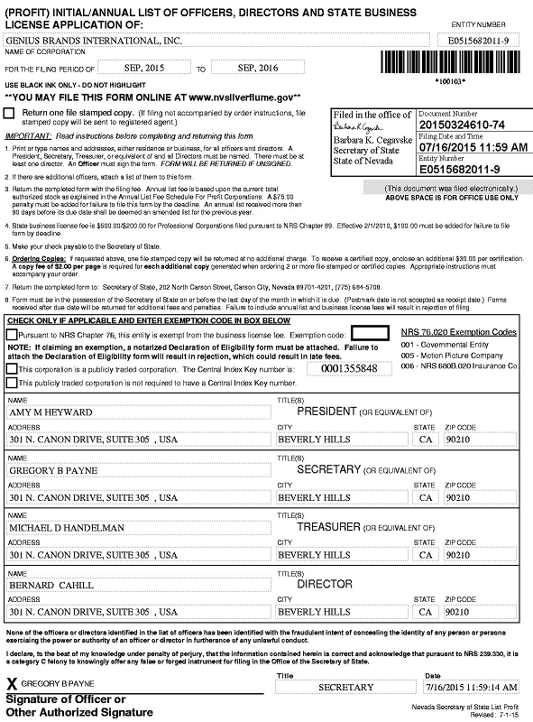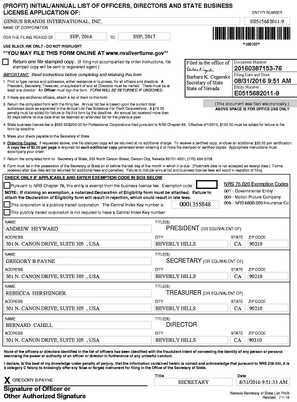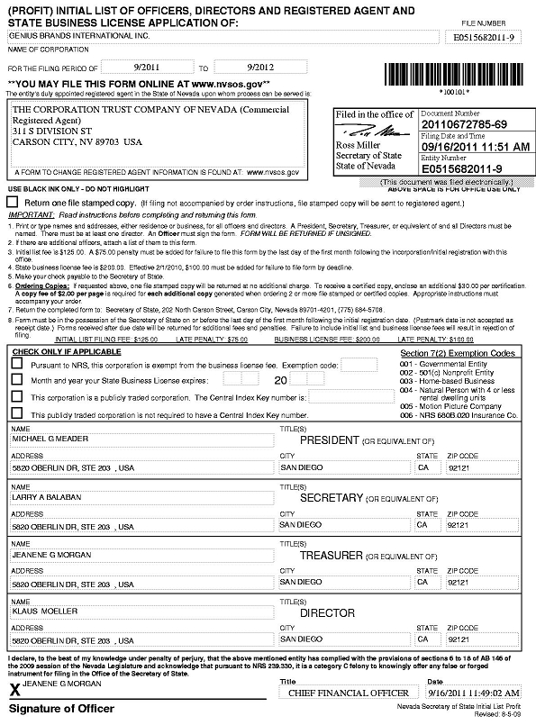 (Profit) Initial List of Officers, Directors and Registered Agent and State Business License Application of Genius Brands International, Inc. 9/16/2011