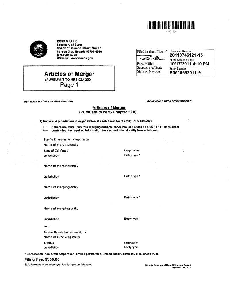 WHEREAS, Genius is a wholly-owned .subsidiary corporation of Pacific organized and existing under the laws of the State of Nevada, having been incorporated on September 16, 2011, under the Nevada Revised Statutes; and