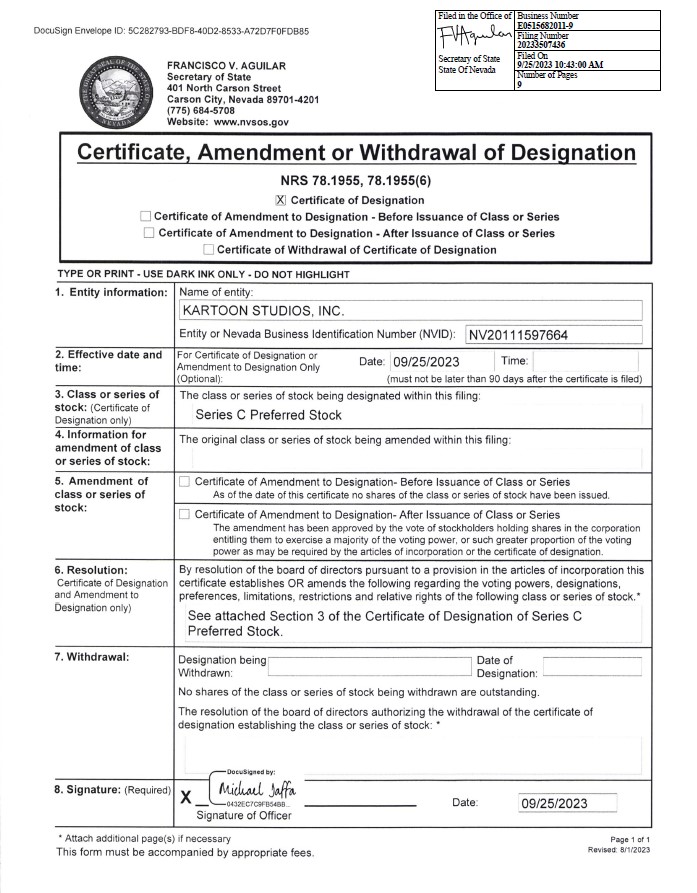 I, Michael Jaffa, hereby certify that I am the Chief Operating Officer, General Counsel and Corporate Secretary of Kartoon Studios, Inc. (the “Corporation”), a corporation incorporated and existing under Chapter 78 of the Nevada Revised Statues (the “Nevada Private Corporations Law” or the “NRS”), and further do hereby certify that, pursuant to the authority expressly conferred upon the board of directors of the Corporation (the “Board of Directors”) by the Corporation’s Articles of Incorporation, as amended (the “Articles of Incorporation”), the Board of Directors on September 21, 2023 adopted the following resolutions creating a series of shares of Preferred Stock designated as Series C Preferred Stock, none of which shares have been issued: